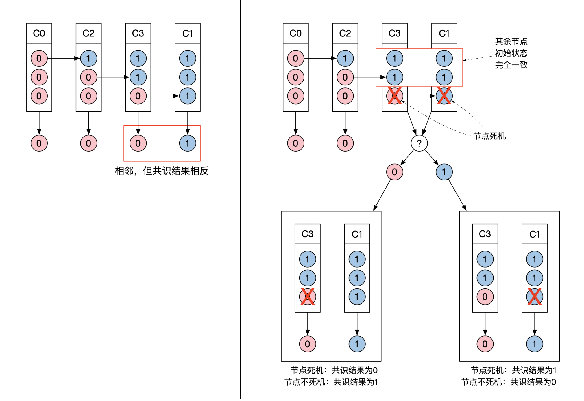 我们假设C2和C3对应的共识结果都为0,这样C3和C1这两个相邻的初始状态集合,就会有不同的共识结果: