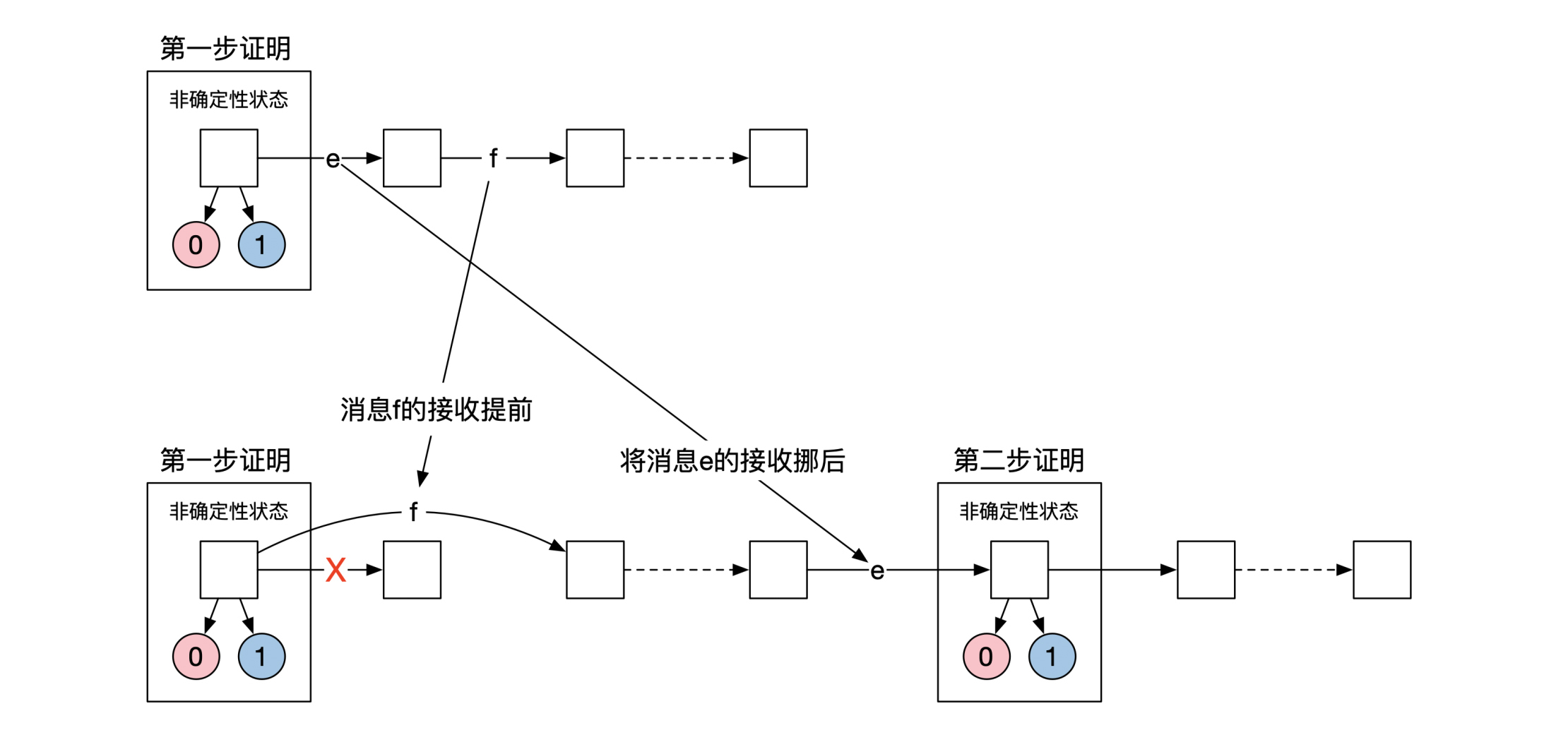 这样每当到达了一个不确定性状态,我们可以将消息e往后挪,从而制造出下一个不确定性状态。由于这个过程可以永远重复下去,系统会永远处于非确定性状态,这就违反了共识算法的第一个特性终止性。示意图如下: