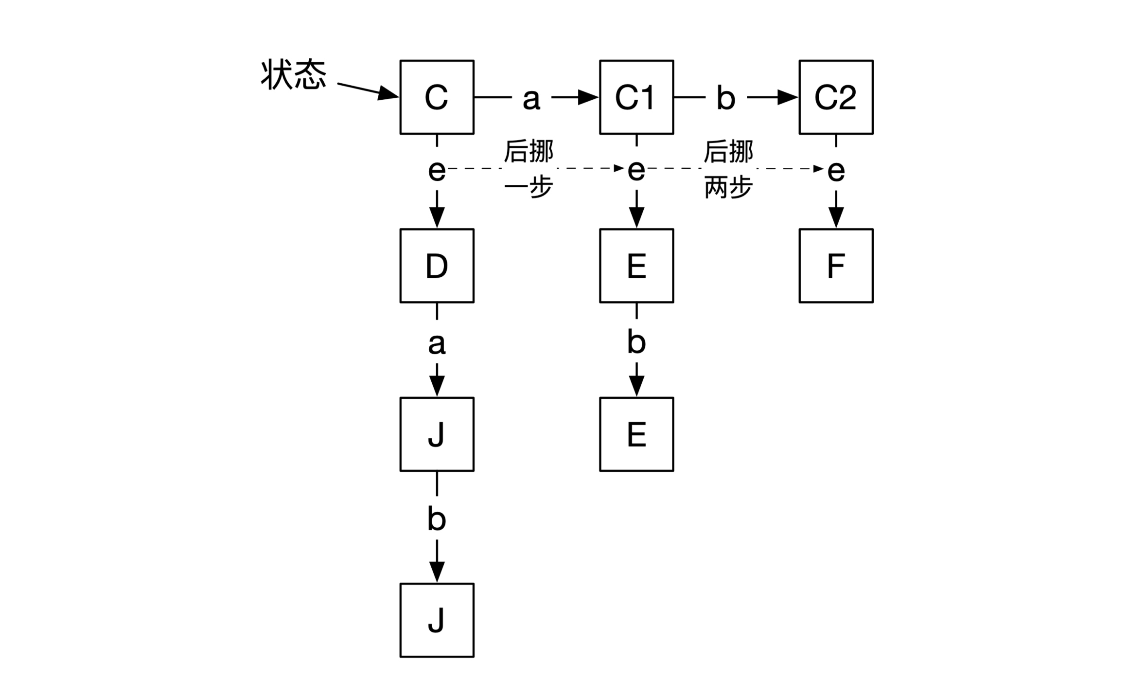 按照第二步的证明,我们能够找到下一个非确定性状态,这个状态刚刚接收了消息e。如下图所示: