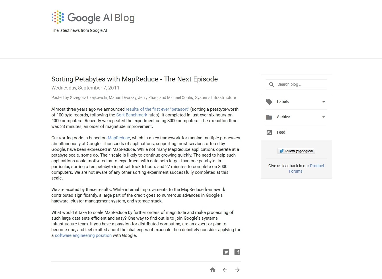 Google曾经在2007年到2012年间做过一个对于1PB数据的大规模排序实验,来测试MapReduce的性能。