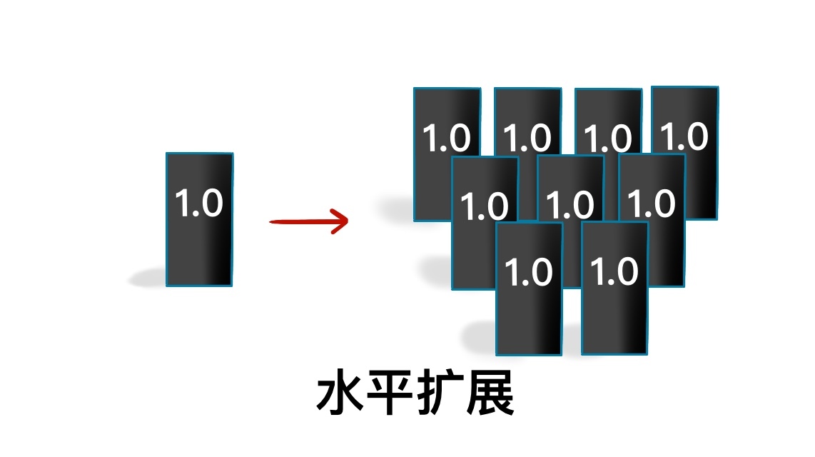 如果要使这个系统的负荷量增加一倍,用水平扩展的办法,我们可以将卡车的数量增加到6辆;用垂直扩展的办法,我们可以使每辆卡车的运输量增加一倍,或者使每辆卡车的速度增加一倍。