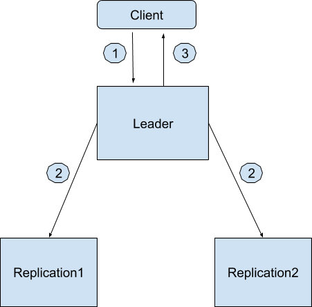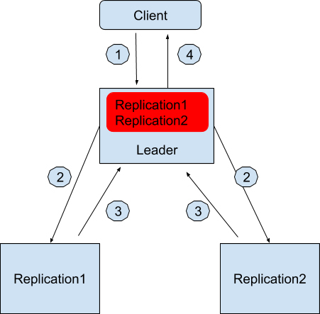 领导者节点收到请求后先在本地保存好,然后也同时发消息通知Replication1和Replication2。