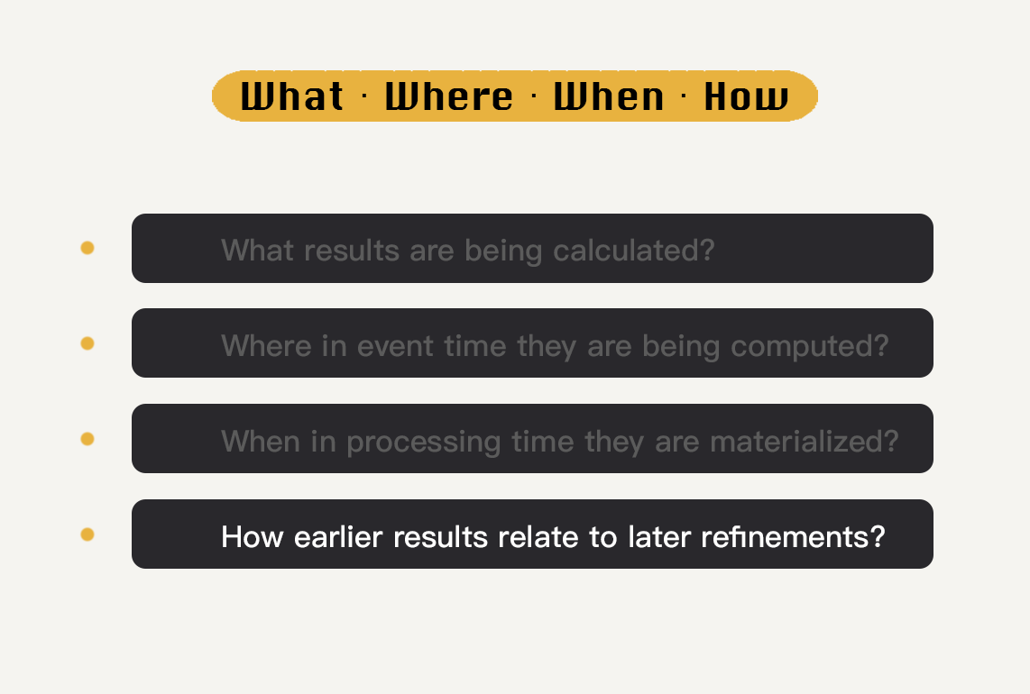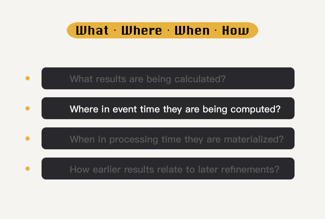 在模块四的后续的内容中,我们会围绕着这四个问题展开具体的分析,看看在Beam的实战中,这每一步是如何被解答的。