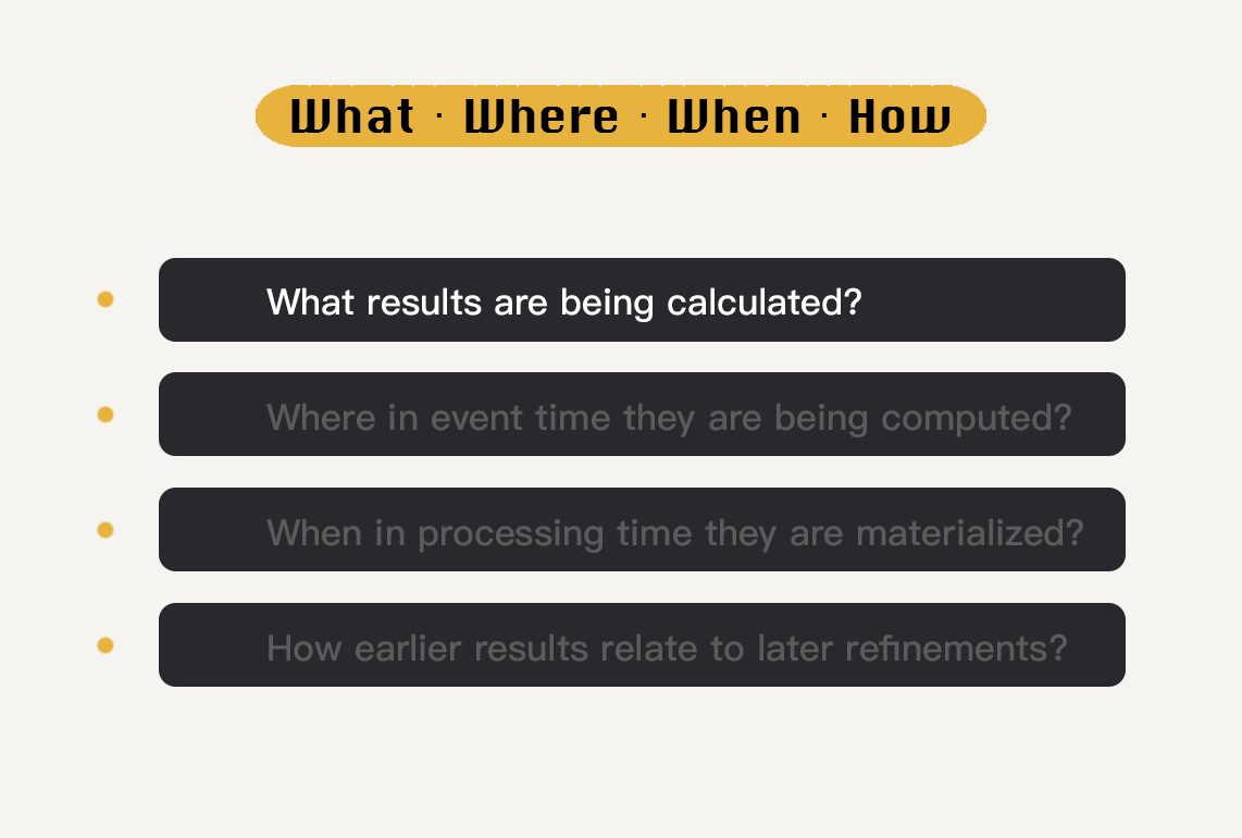 懂得了这几个概念之后,我来告诉你究竟Beam编程模型中的“WWWH”是什么。它们分别是:What、Where、When、How。