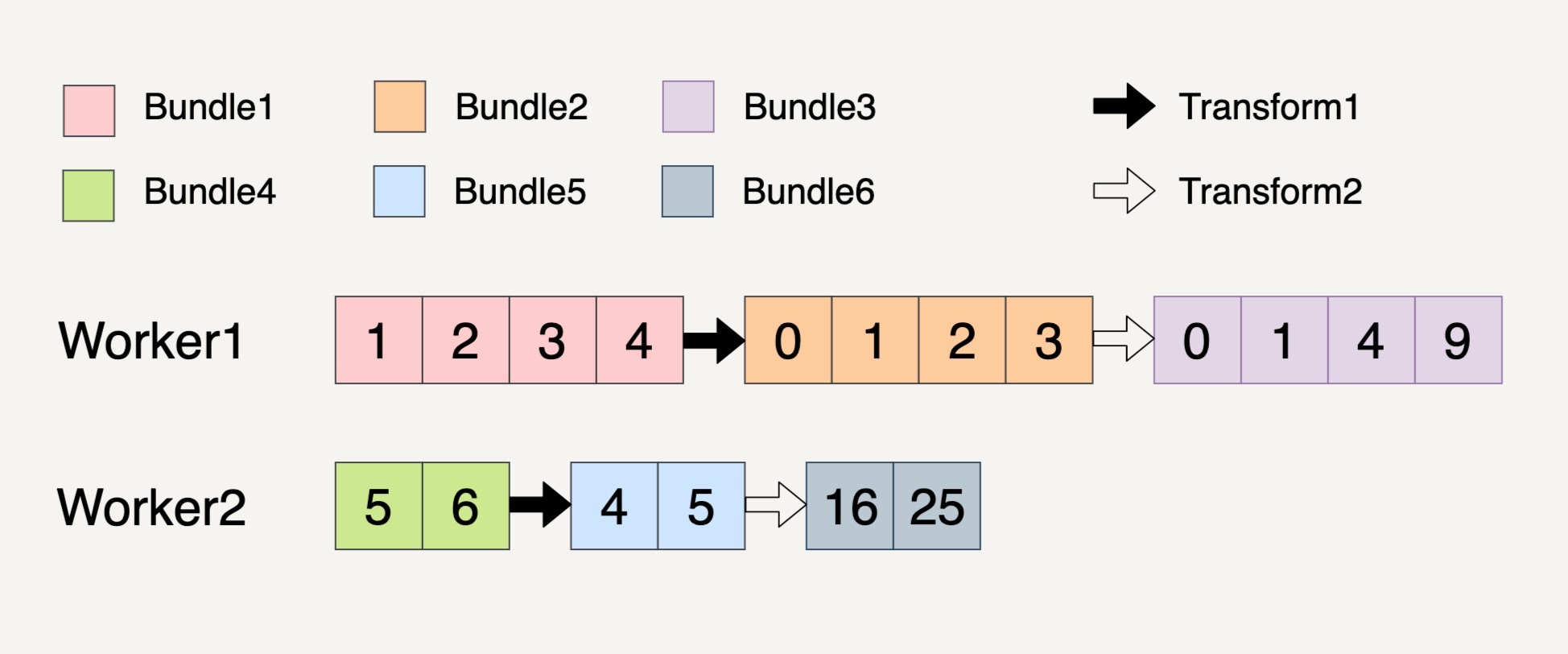 Beam数据流水线的底层思想其实还是动用了MapReduce的原理,在分布式环境下,整个数据流水线会启动N个Workers来同时处理PCollection。而在具体处理某一个特定Transform的时候,数据流水线会将这个Transform的输入数据集PCollection里面的元素分割成不同的Bundle,将这些Bundle分发给不同的Worker来处理。