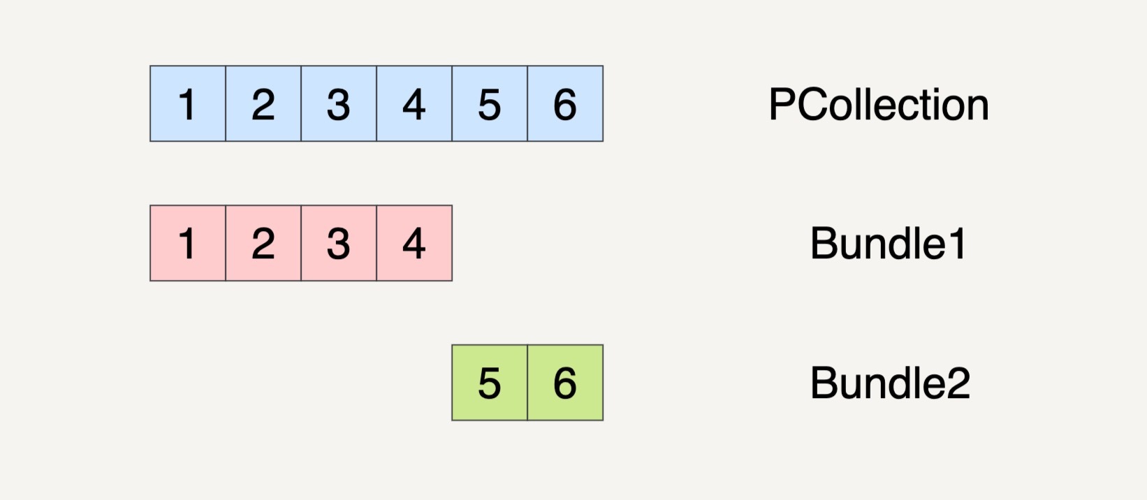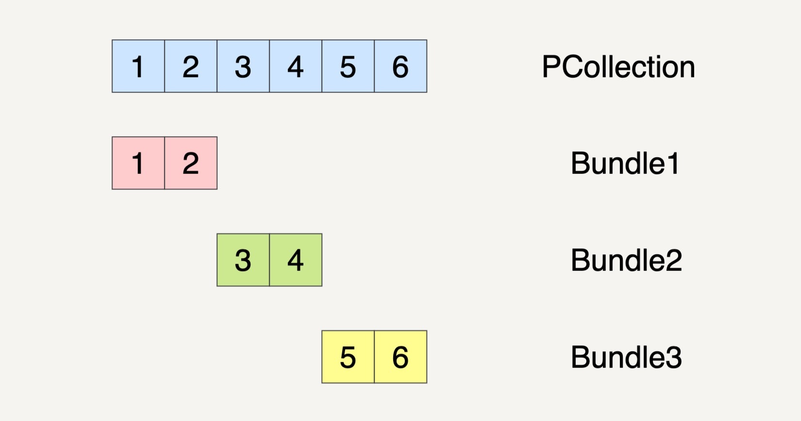 假设在数据流水线的一个Transform里面,它的输入数据集PCollection是1、2、3、4、5、6这个6个元素。数据流水线可能会将这个PCollection按下图的方式将它分割成两个Bundles。