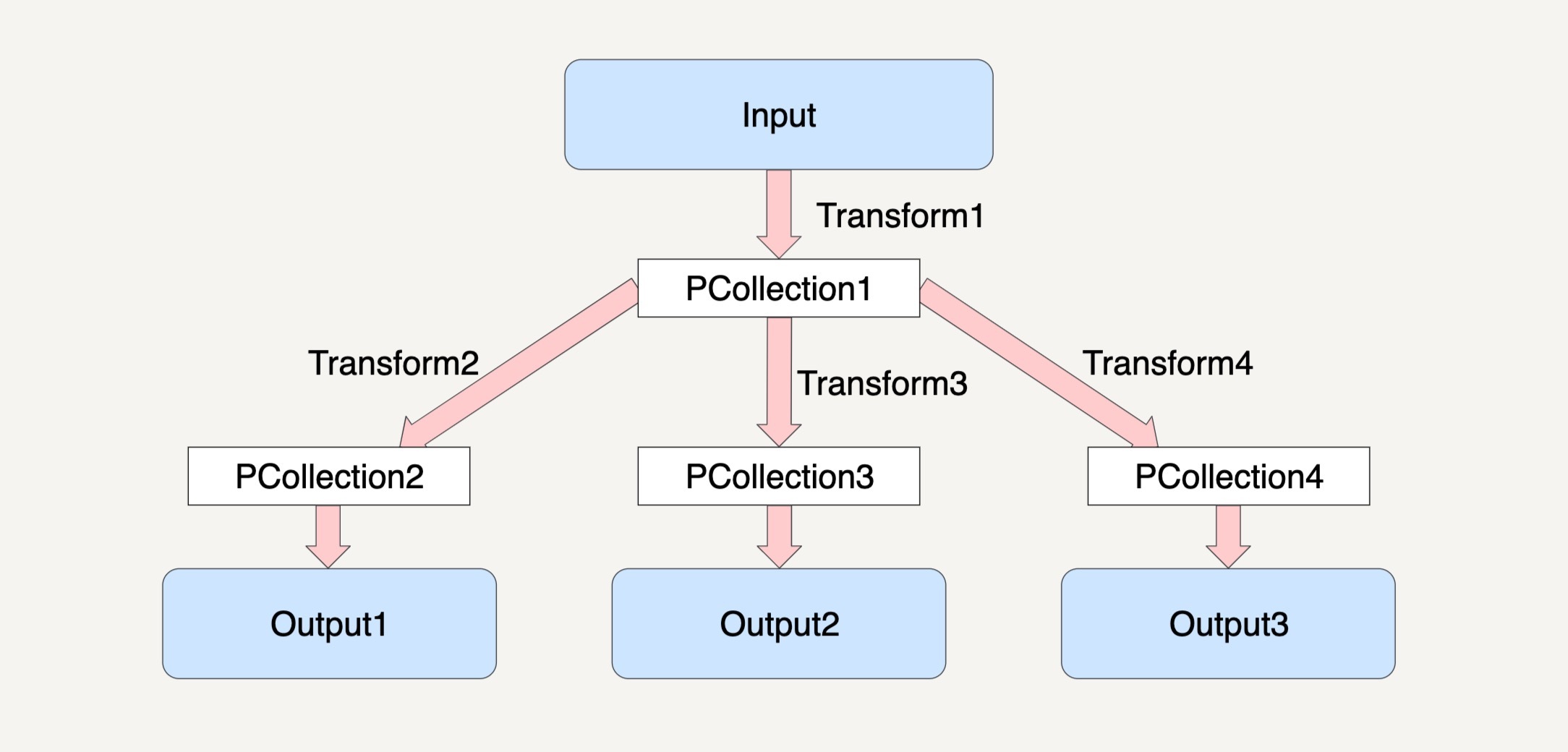 例如下图所示,对于PCollection1,我们可以使三个不同的Transform应用在它之上,从而再产生出三个不同的PCollection2、PCollection3和PCollection4出来。