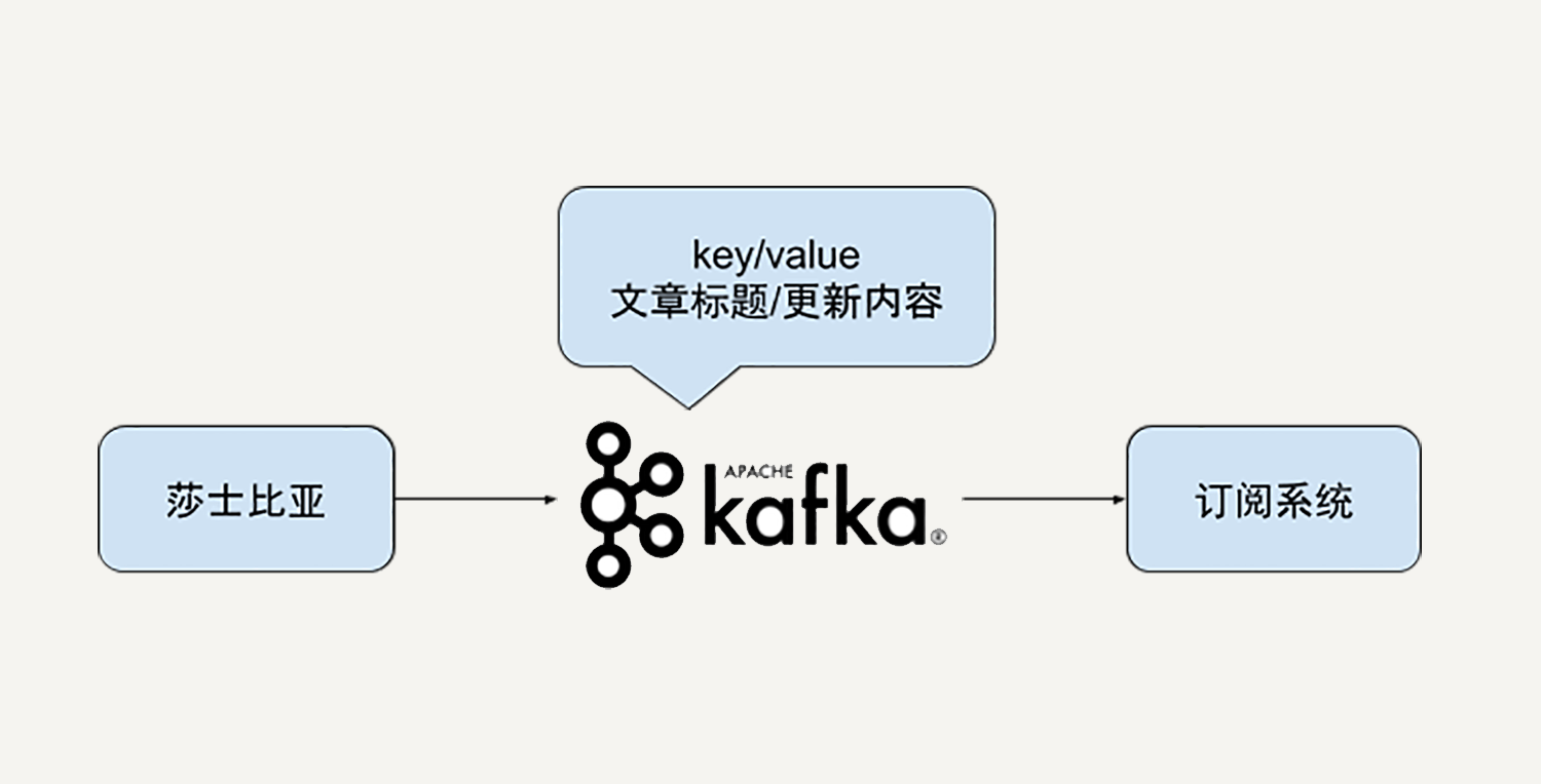 如下图所示,即使你并没有使用过Kafka也没有关系。你只需要知道在我们的数据处理系统中能够不定时地收到来自莎士比亚的文章更新,每一次的文章更新包含了更新的文章标题和更新内容。