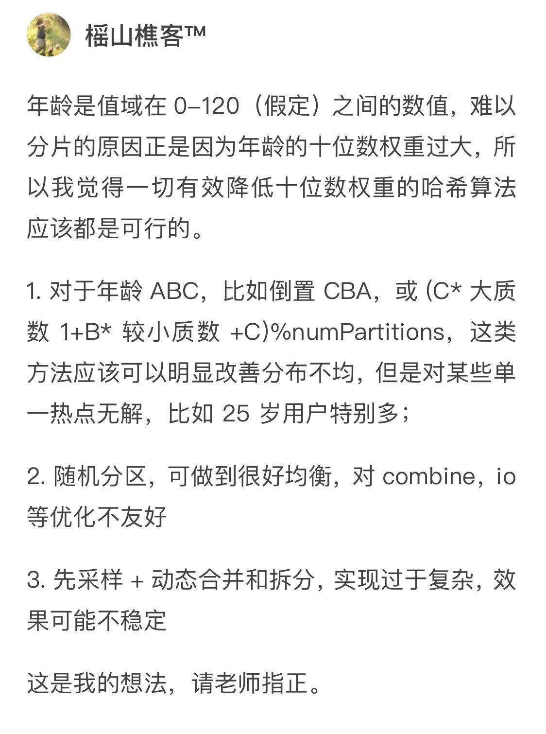 还有这位Mark Lee,他认为可以使用身份证后面的随机数来进行分片,纯技术上看起来似乎可行。但要使用用户的身份ID的话,你还需要考虑是否符合法律、道德、隐私方面的问题。
