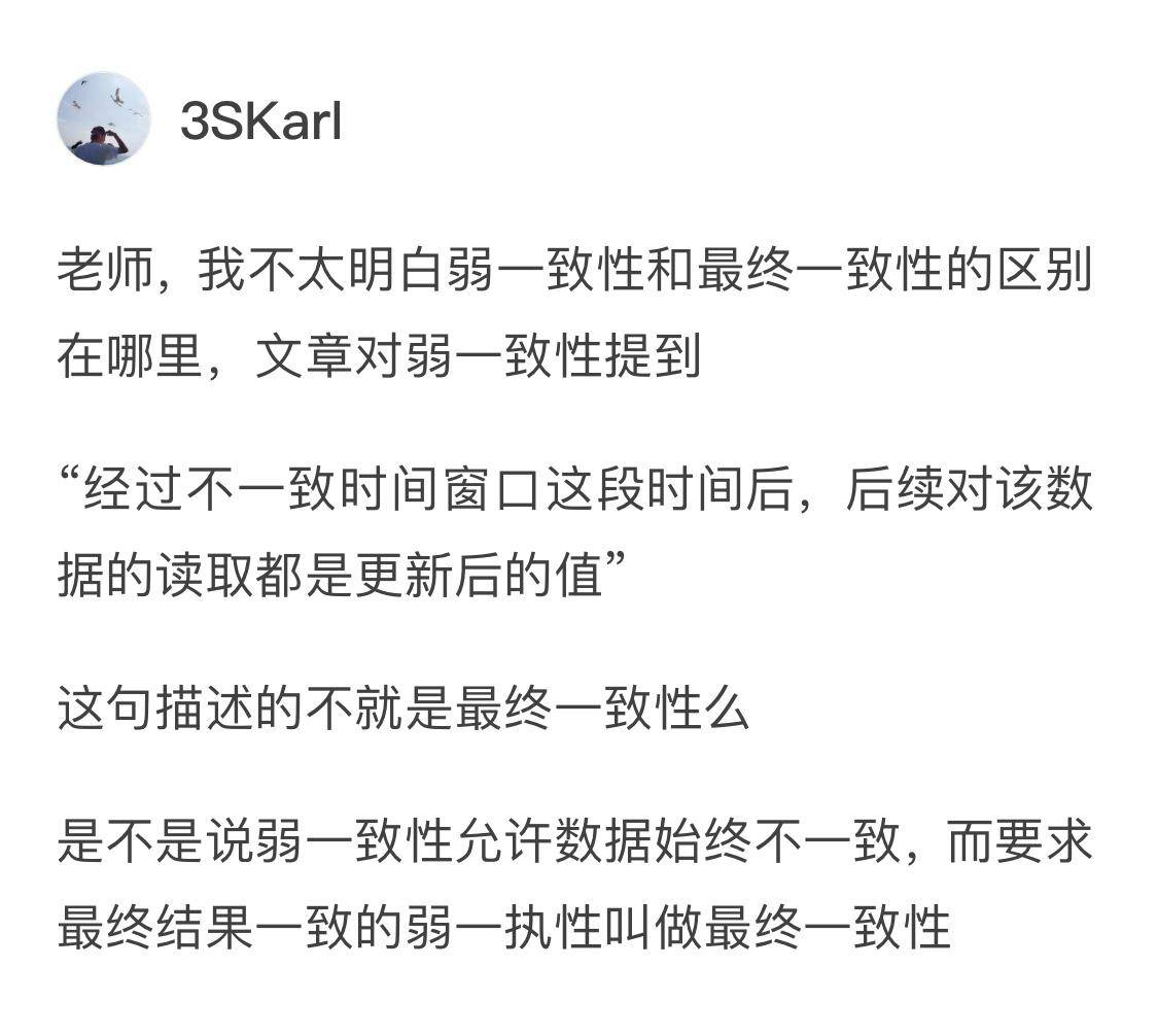 第五讲中讲的主要是分布式处理系统的三个重要指标:扩展性,一致性和持久性。根据这个内容,3SKarl同学提问弱一致性和最终一致性的区别是什么。
