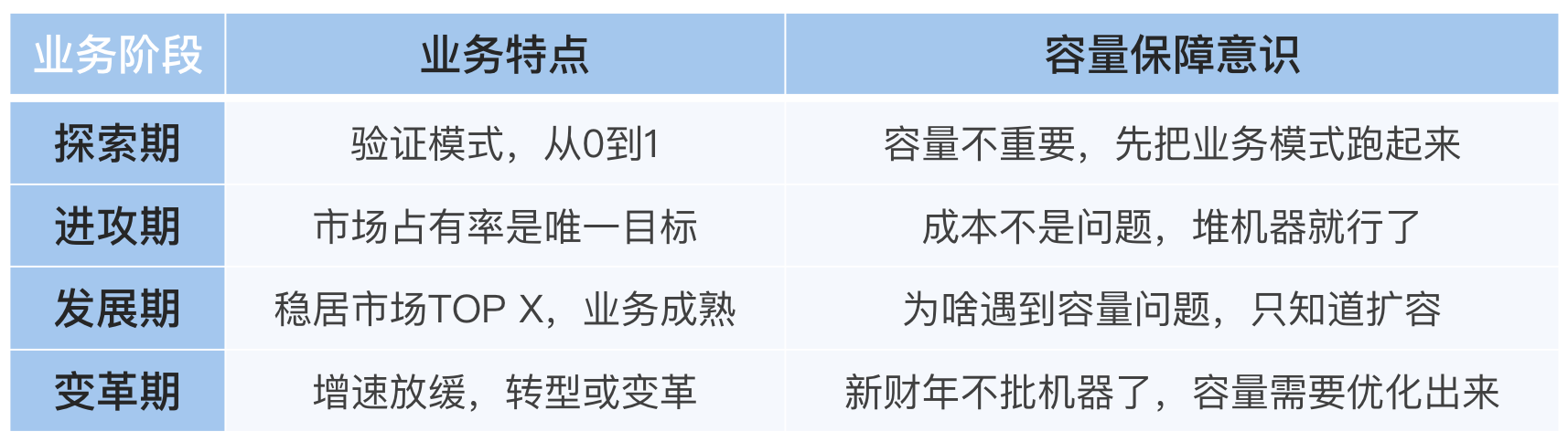 很幸运的是,我几乎经历过大型电商的所有这四个业务阶段,深深感受到了公司管理层对于容量保障工作的思维变迁。在业务探索期,所有人关心的都是业务行不行,我们能不能活下去;在业务进攻期,我们全站的平均CPU利用率还不到10%,申请服务器从来不设卡;到了业务发展期,我讲的最多的话就是“不要简单扩容,先看看服务有没有优化的空间”;而到了业务变革期,CPU利用率长期低于某个水位是要被挑战的,无脑的扩容申请一般都会被拒绝。