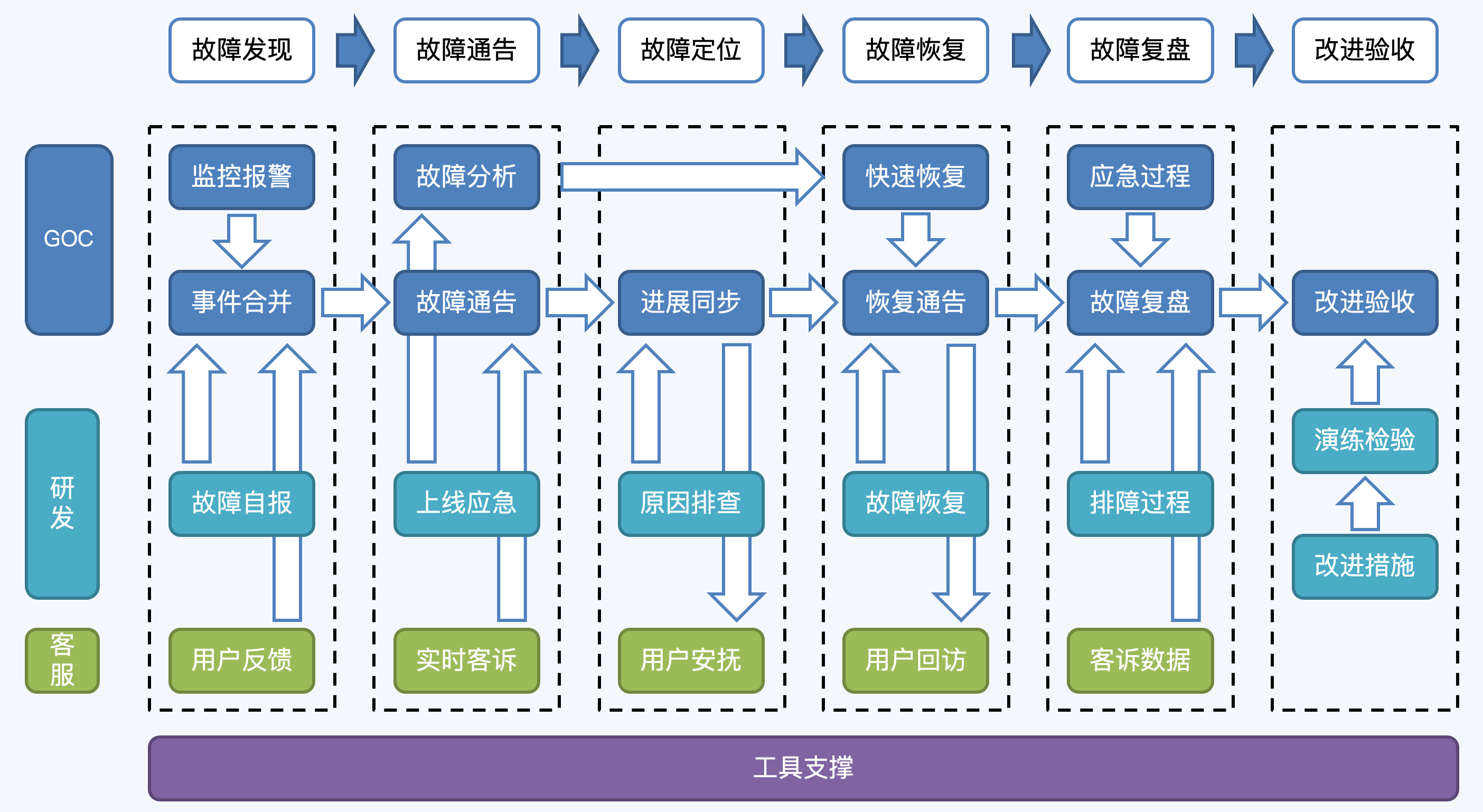 如果没有GOC团队作为大脑指挥,很难想象这样的流程能够顺畅执行。GOC的组织形式很好的发挥了集中式团队的统一管理优势,GOC本身并不直接介入技术细节,而是指导和推动相应的业务技术团队。