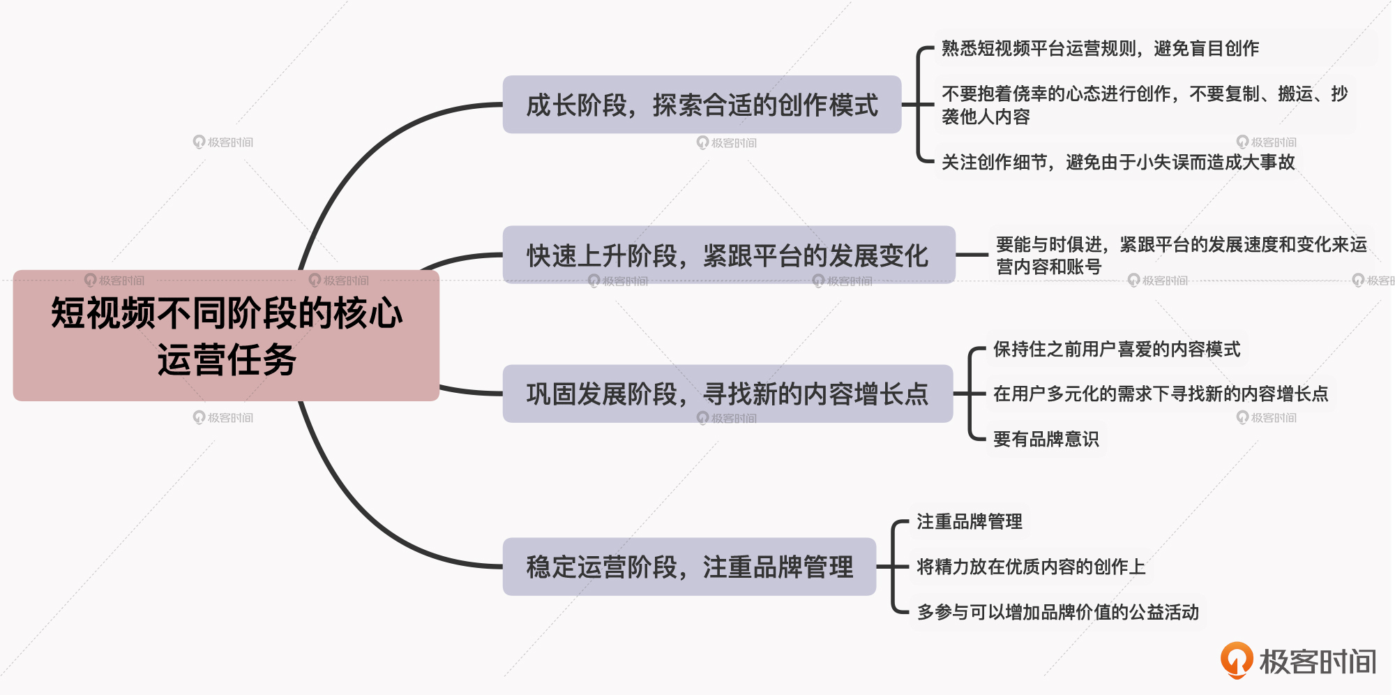 这节课,我给你介绍了短视频从入门到精通的不同阶段的运营任务,以及每个阶段中需要注意的坑点问题。你只有明确了自己在当前创作阶段的核心运营任务,才能避免踏入深坑,少走弯路,也才能将自己创造的内容价值最大化和长久化,让账号获得更平稳、更快速的成长,并能抓住合适的变现机遇,不至于半路夭折而又束手无策。