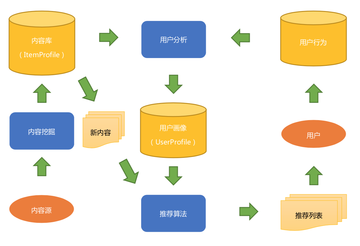 内容这一端:内容源经过内容分析,得到结构化的内容库和内容模型,也就是物品画像。用户这一端:用户看过推荐列表后,会产生用户行为数据,结合物品画像,经过用户分析得到用户画像。