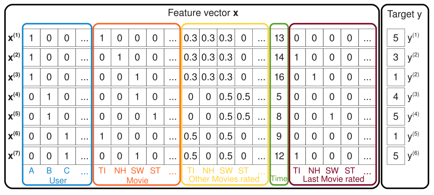 这张图中每一条样本都记录了用户对电影的评分,最右边的y是评分,也就是预测目标;左边的特征有五种,用户ID、当前评分的电影ID、曾经评过的其他分、评分时间、上一次评分的电影。