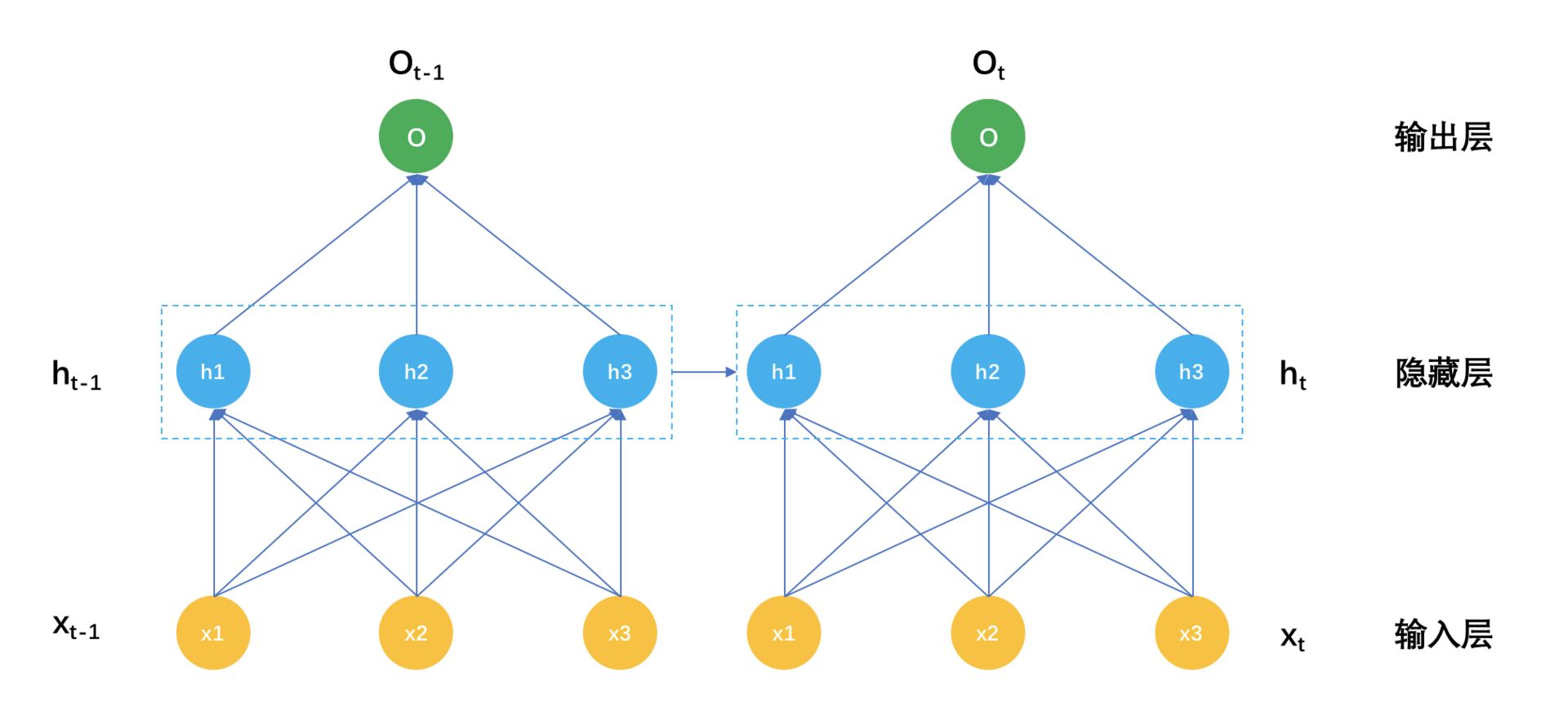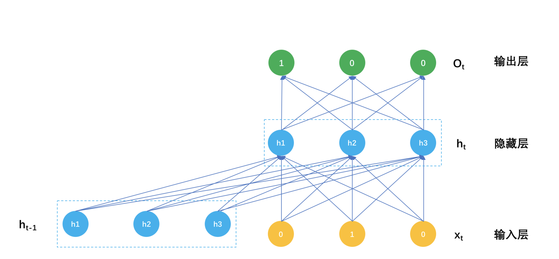 除此之外,每一个隐藏层神经元还依赖上一个时刻自己的输出值,隐藏层神经元是k个,一个k维向量。