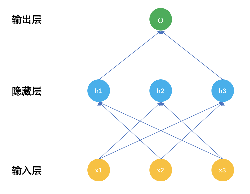 普通神经网络有三个部分,输入层x,隐藏层h,输出层o,深度神经网络的区别就是隐藏层数量有很多,具体多少算深,这个可没有定论,有几层的,也有上百层的。