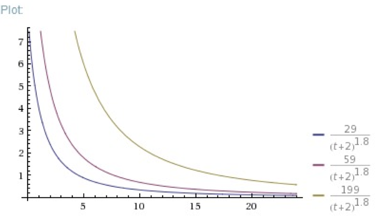 公式中,分子是简单的帖子数统计,一个小技巧是去掉了作者自己的投票。分母就是将前面说到的时间因素考虑在内,随着帖子的发表时间增加,分母会逐渐增大,帖子的热门程度分数会逐渐降低。