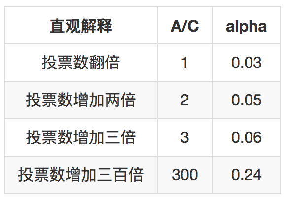 问题来了,这个反映物品自然冷却快慢的 \(\\alpha\) 该如何确定呢?有一个更直观的办法。假如一个物品在时间过去B个单位后,因为增加了A个投票数,而保持了热门程度不变,那这样的话 \(\\alpha\) 应该是多少呢?简单把这个描述列成方程就是下面的样子。