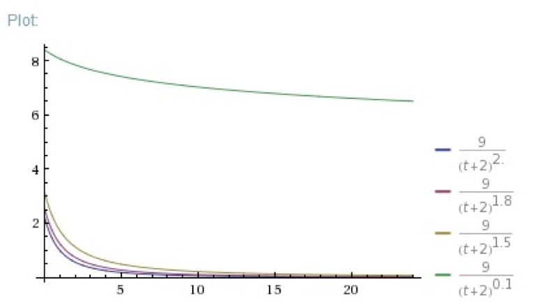 其中,重力因子的选择根据情况而定,重力因子越大,帖子的热度衰减越快,不同的重力因子对比如下图所示。