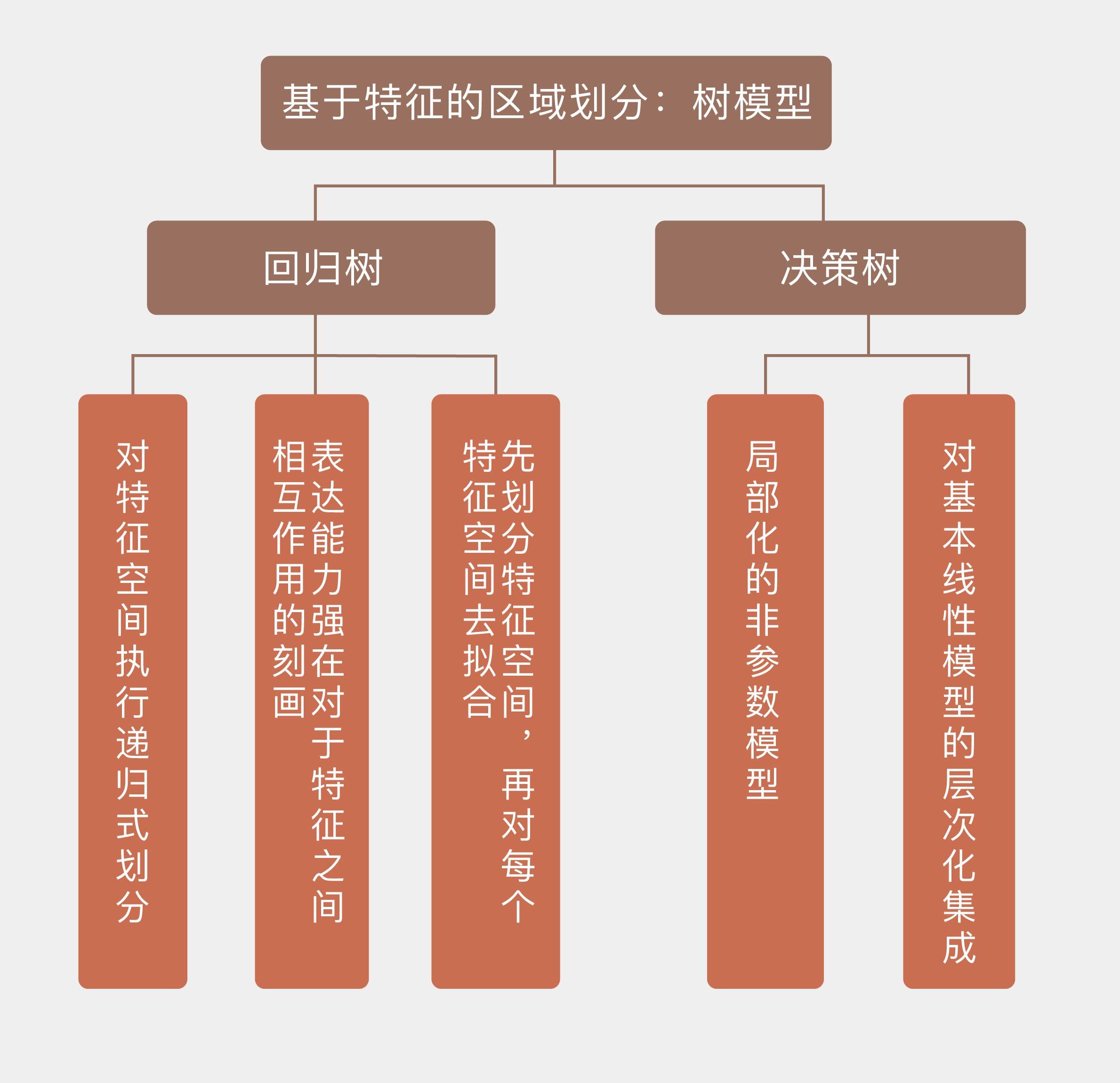 广义来看,决策树可以视为对基本线性模型的层次化集成,这里的基本模型就是数据在每个划分区域上的回归或分类规则,这些规则一般是线性的。决策树的作用是将这些固定的局部线性规则进行拼接式的组合,从而生成整体意义上的非线性模型。后面我们将发现,看似简单的集成策略却能在机器学习中发挥出出人意料的优异性能。