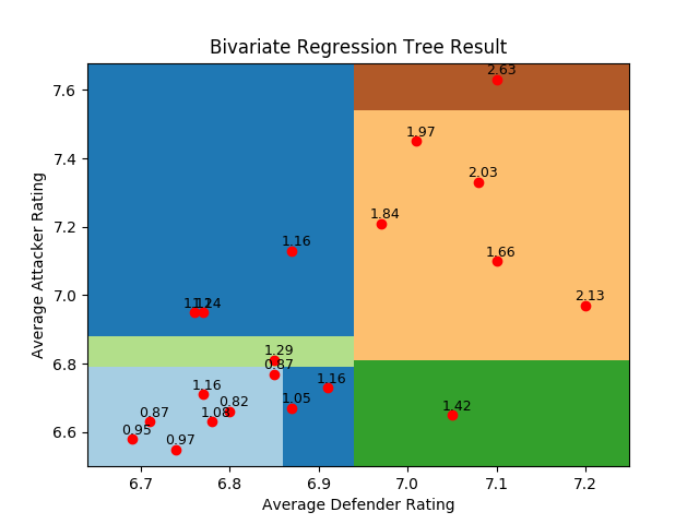 为了进一步考察回归树在多元回归问题中的表现,并观察回归树对特征之间的交互的处理方式,我们再来看看用回归树去拟合位置评分数据和场均积分的关系。出于便于可视化的考虑,在位置评分中我只选择了后卫评分和前锋评分两者作为输入的特征。选择这两者的考虑是在前面的多元回归分析中已经证明,这两个属性和积分之间存在较强的相关性,而两个属性所映射的二维平面也更容易观察。