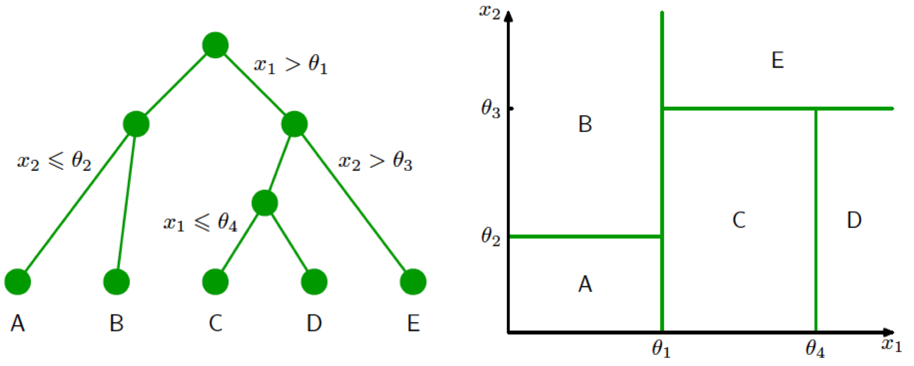 决策树的生成与对特征空间的划分(图片来自Pattern Recognition and Machine Learning, 图14.5 & 14.6)