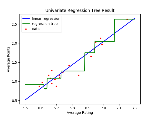 为了测试回归树的效果,我用它对一直应用于回归任务的英超数据集进行了拟合,结果如下。实现回归树需要调用Scikit-learn库中tree模块的DecisionTreeRegressor类。在拟合时,回归树的最大深度被设置为3,这意味着对特征空间的划分次数为3次,最多可以分成\(2 ^ 3 = 8\)个区域。可以看到,在一维的情形下,回归树其实是分段的常数函数,只不过不同分段之间的分界点并不是人为指定,而是通过方差下降的方法计算出来的。