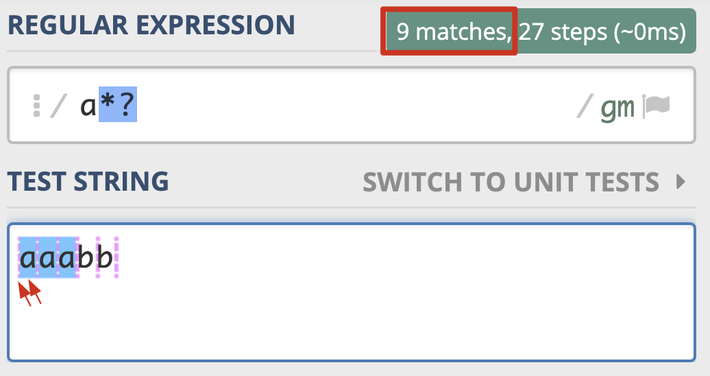 那么如何将贪婪模式变成非贪婪模式呢?我们可以在量词后面加上英文的问号(?),正则就变成了 a*?。此时的匹配结果如下:-