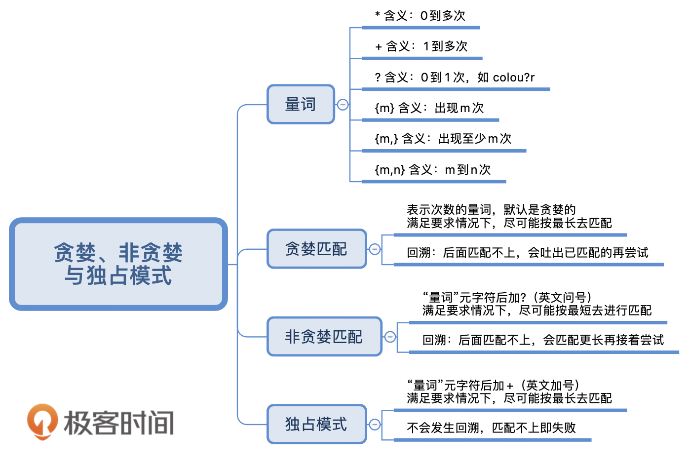 最后我来给你总结一下:正则中量词默认是贪婪匹配,如果想要进行非贪婪匹配需要在量词后面加上问号。贪婪和非贪婪匹配都可能会进行回溯,独占模式也是进行贪婪匹配,但不进行回溯,因此在一些场景下,可以提高匹配的效率,具体能不能用独占模式需要看使用的编程语言的类库的支持情况,以及独占模式能不能满足需求。