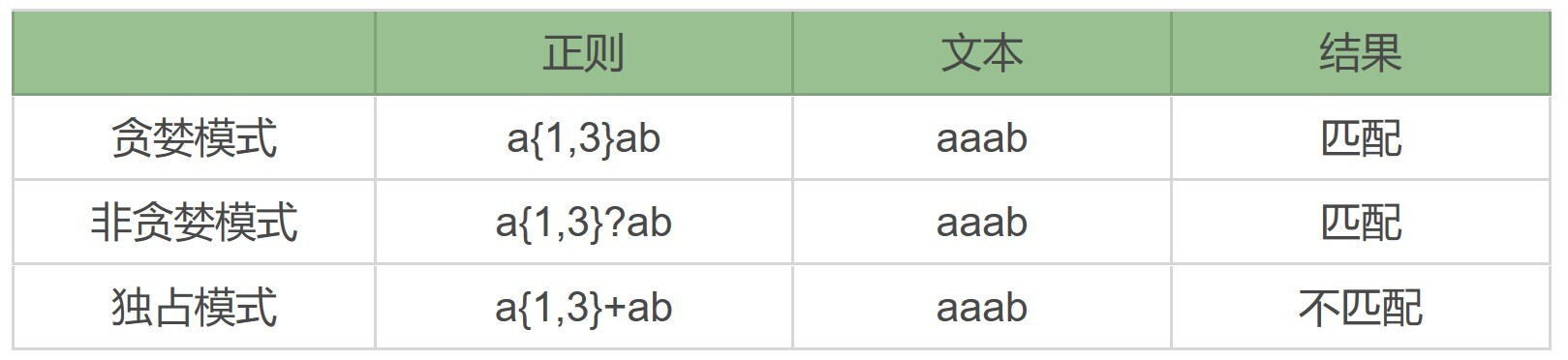 如果你用 a{1,3}+ab 去匹配 aaab 字符串,a{1,3}+ 会把前面三个 a 都用掉,并且不会回溯,这样字符串中内容只剩下 b 了,导致正则中加号后面的 a 匹配不到符合要求的内容,匹配失败。如果是贪婪模式 a{1,3} 或非贪婪模式 a{1,3}? 都可以匹配上。