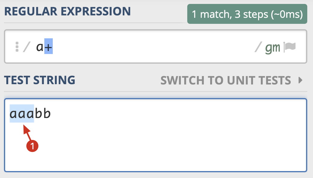 表示量词的星号(*)和 加号(+)可能没你想象的那么简单,我用一个例子给你讲解一下。我们先看一下加号(+),使用 a+ 在 aaabb 中查找,可以看到只有一个输出结果: