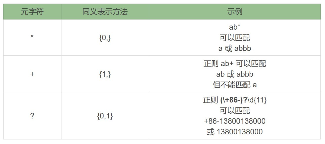 由于本节内容和量词相关的元字符密切相关,所以我们先来回顾一下正则中表示量词的元字符。