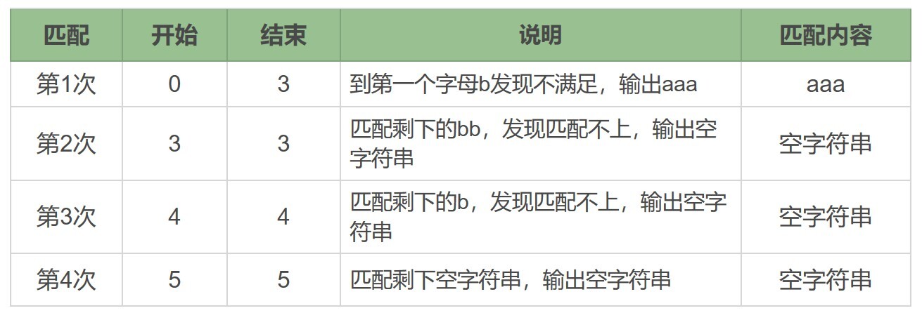 a* 在匹配开头的 a 时,会尝试尽量匹配更多的 a,直到第一个字母 b 不满足要求为止,匹配上三个a,后面每次匹配时都得到了空字符串。