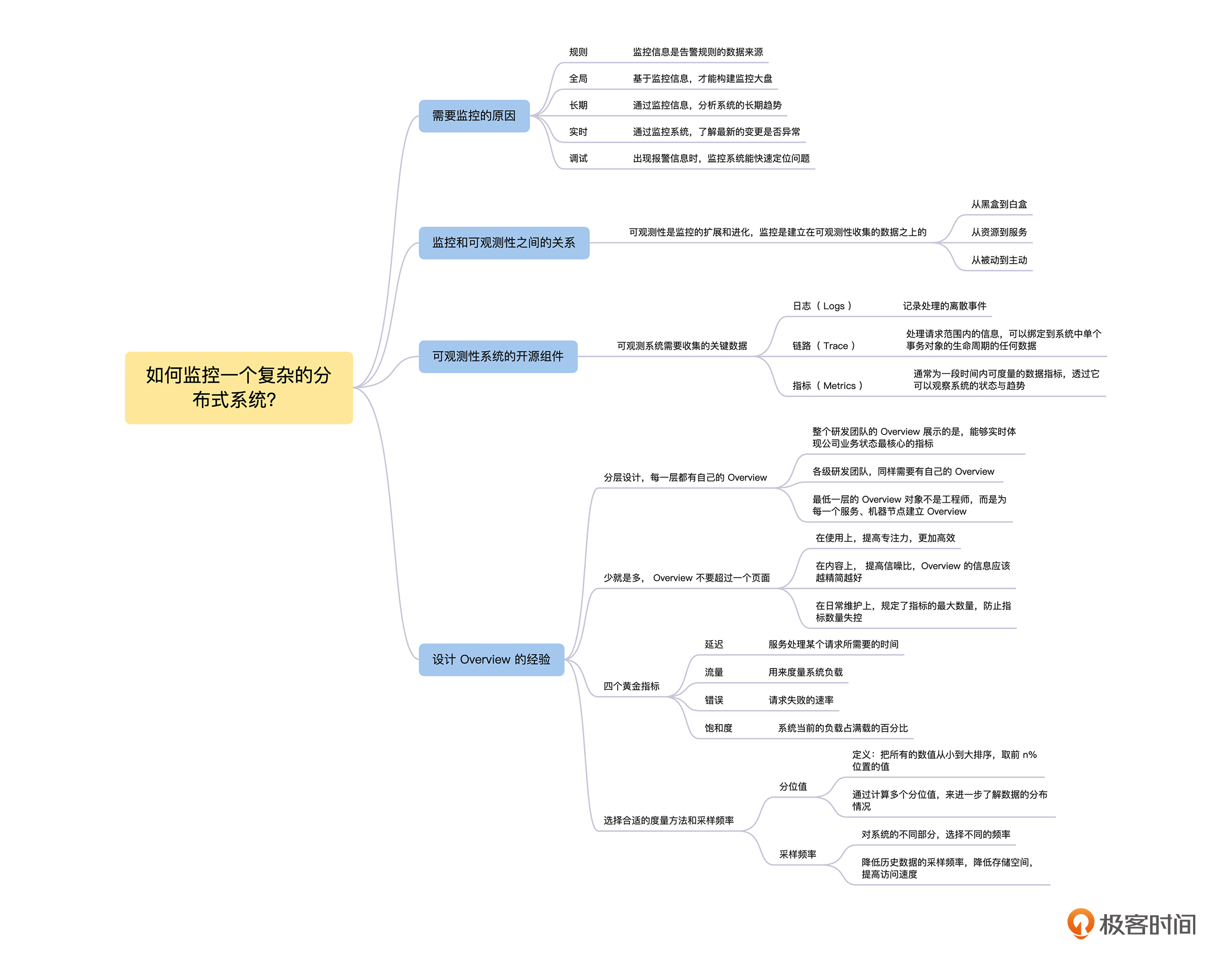 其实这就是分布式系统中的可观测性问题,那么从这节课开始,我们将用 2 节课的时间来讨论,如何通过分布式系统的可观测性,来解决系统监控与告警的问题。在这一节课中,我们先讨论需要监控的原因,然后分析监控与可观测性之间的关系,接着介绍搭建一个可观测性系统涉及的开源组件,最后,重点讨论对于一个大规模的分布式系统,设计监控系统应该遵循的经验和原则。