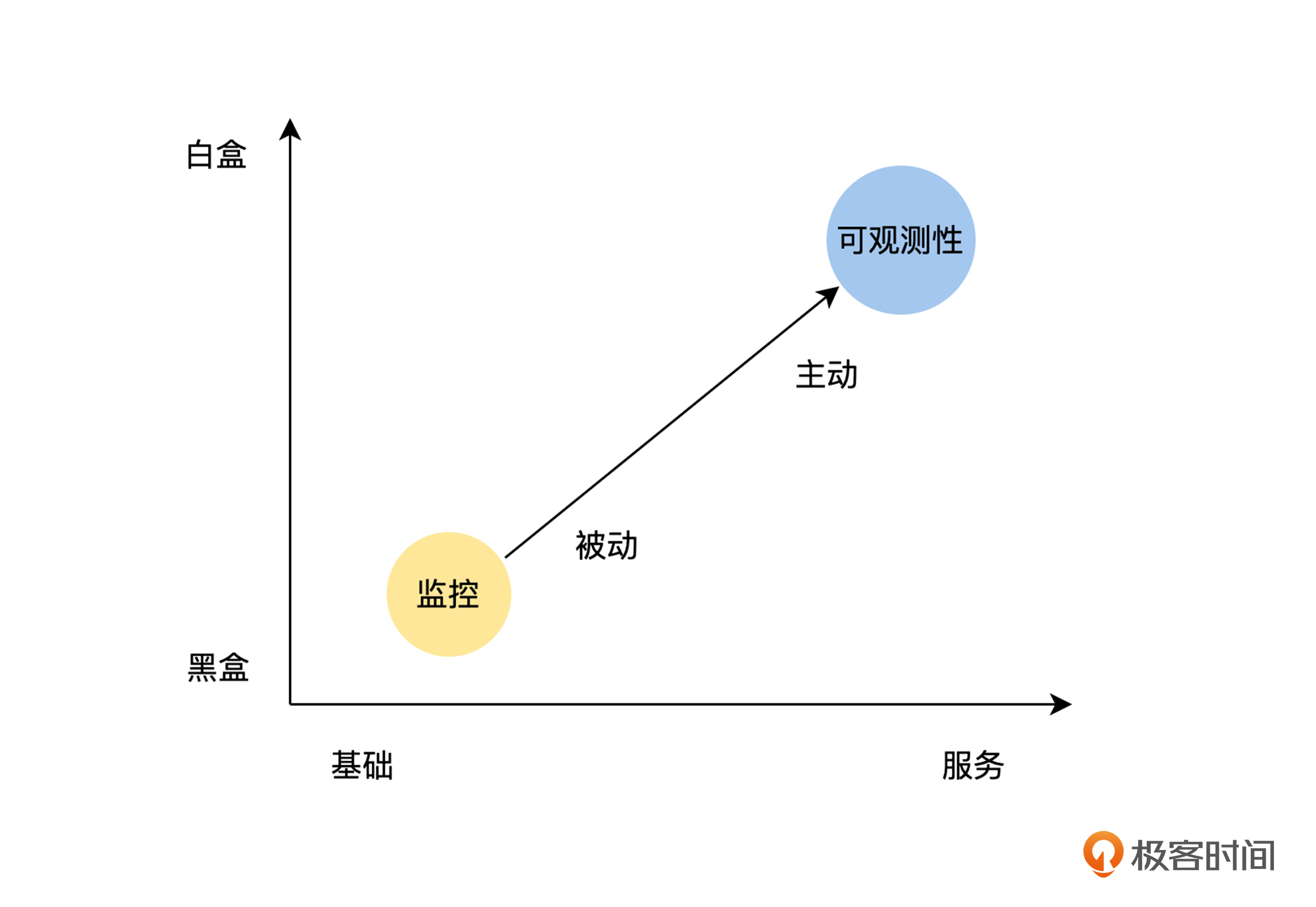 最后,监控到可观测性是处理方式从被动监控到主动分析的进化。在监控为黑盒的情况下,我们完全不了解系统内部的情况,只能等待监控信息触发报警后,再进行处理;而当监控为白盒的情况下,研发人员可以方便地了解系统内部运行的情况,并且进行分析,主动发现问题。