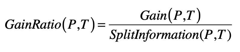 其中\(Gain(P,T)\)是数据集\(P\)使用特征\(T\)之后的信息增益,\(GainRatio(P,T)\)是数据集\(P\)使用特征\(T\)之后的信息增益率。