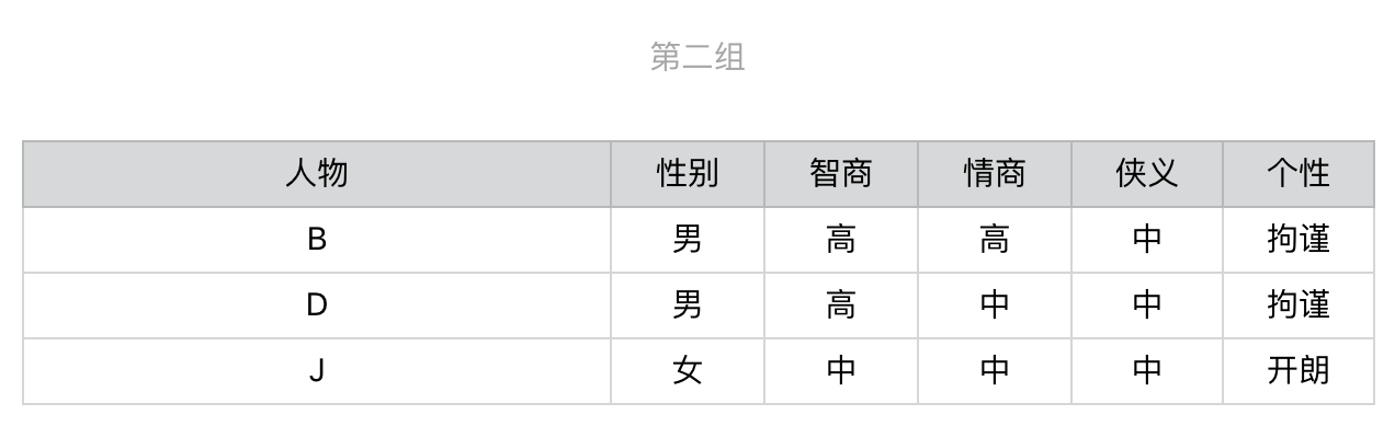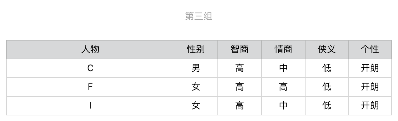 我们现在开始选择第一个问题。首先,依次计算“性别”“智商”“情商”“侠义”和“个性”对人物进行划分后的信息增益。我们得到如下结果: