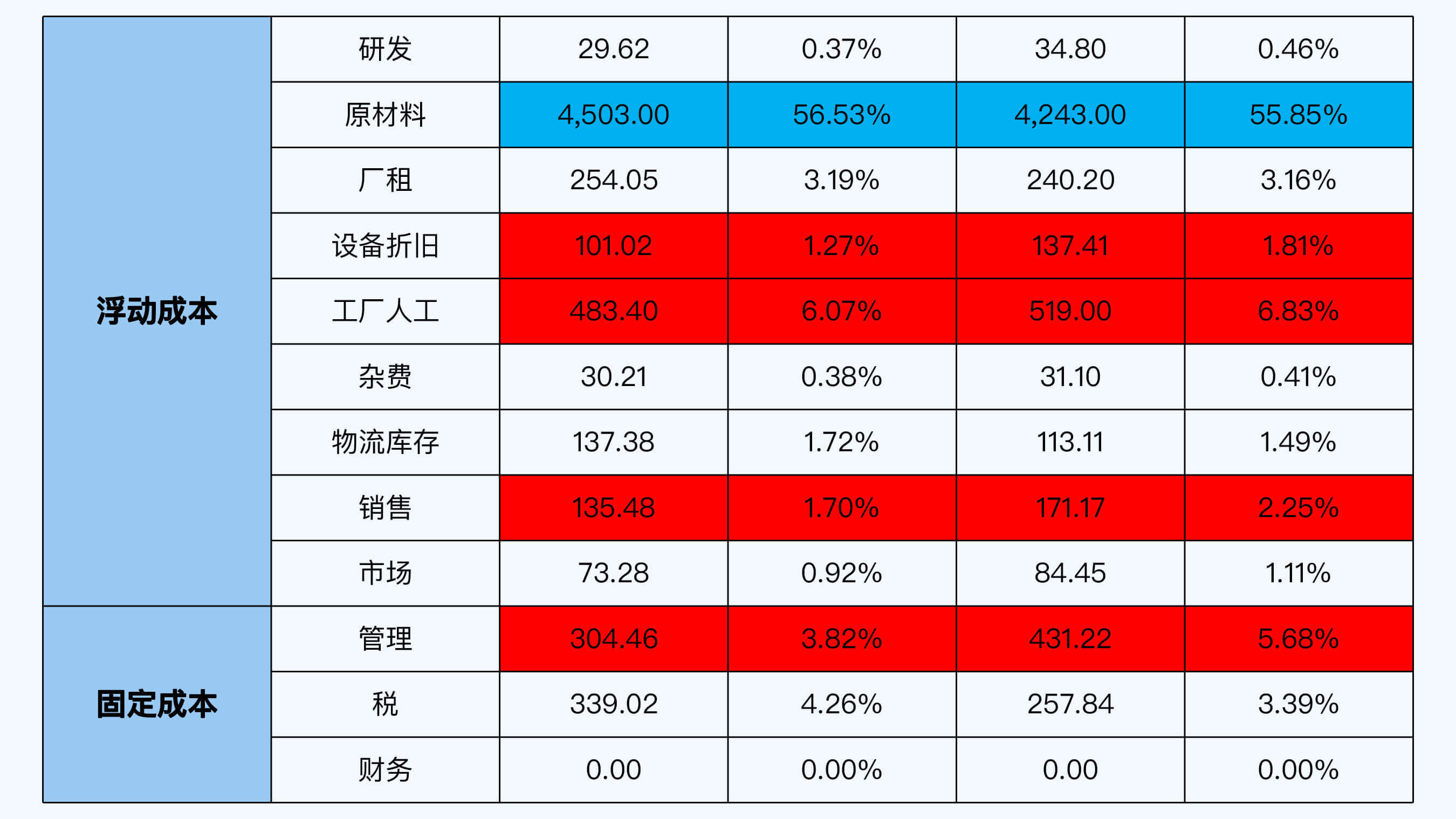 然后,我做出一张成本结构表交给F公司的老板,让F公司的财务把近2年的数据填进去,计算每一项的比例,并且把有明显差异的地方(尤其是成本比例上升的地方)标记出来,红色代表做得不好的地方,蓝色代表做得好的地方,如下所示: