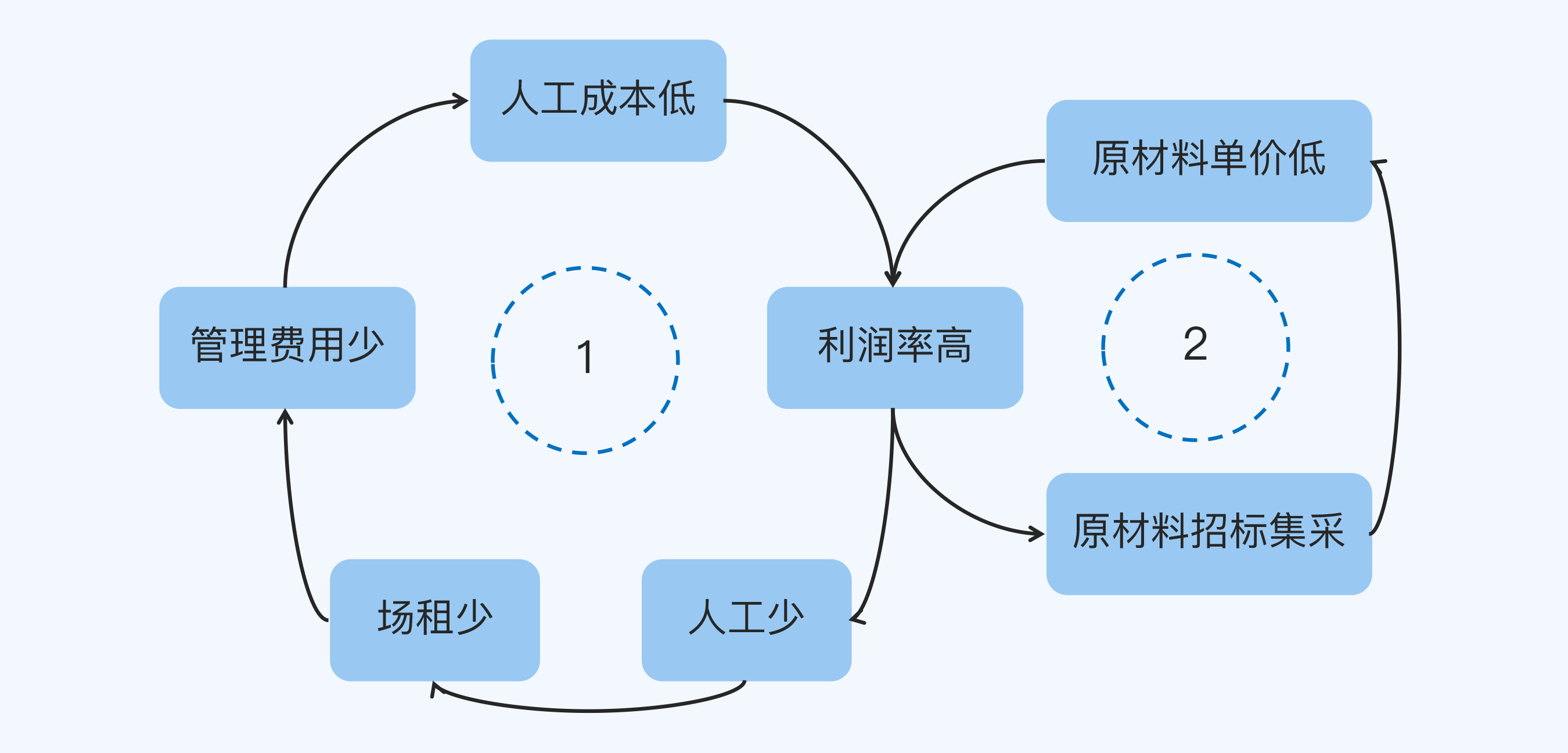 另一方面,如果想要降低原材料单价,集中招标采购的效果远远高于与供应商单次询价砍价的效果(如下图增强循环2)