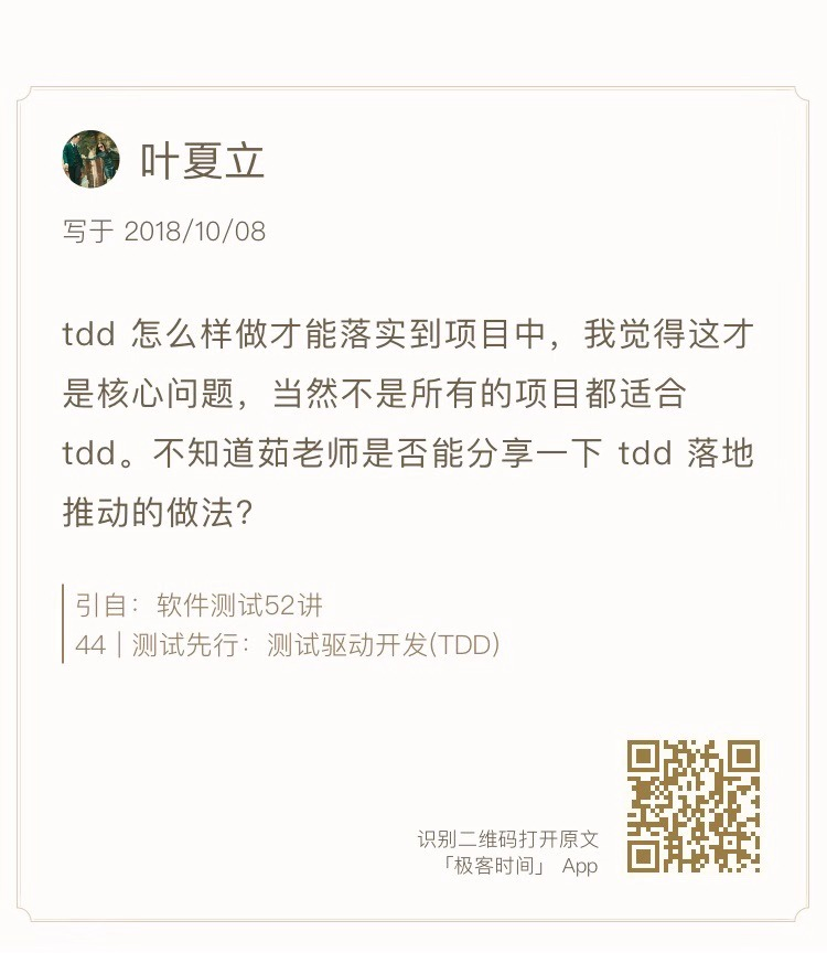 虽然明知落地TDD困难重重,但是你又特别想在自己的项目中尝试TDD,以解决现在的测试方法不能解决的问题。那么,落地TDD有哪些可值得借鉴的经验呢?这也正是很多用户关心的,比如昵称为“叶夏立”的用户在文章下面的留言。