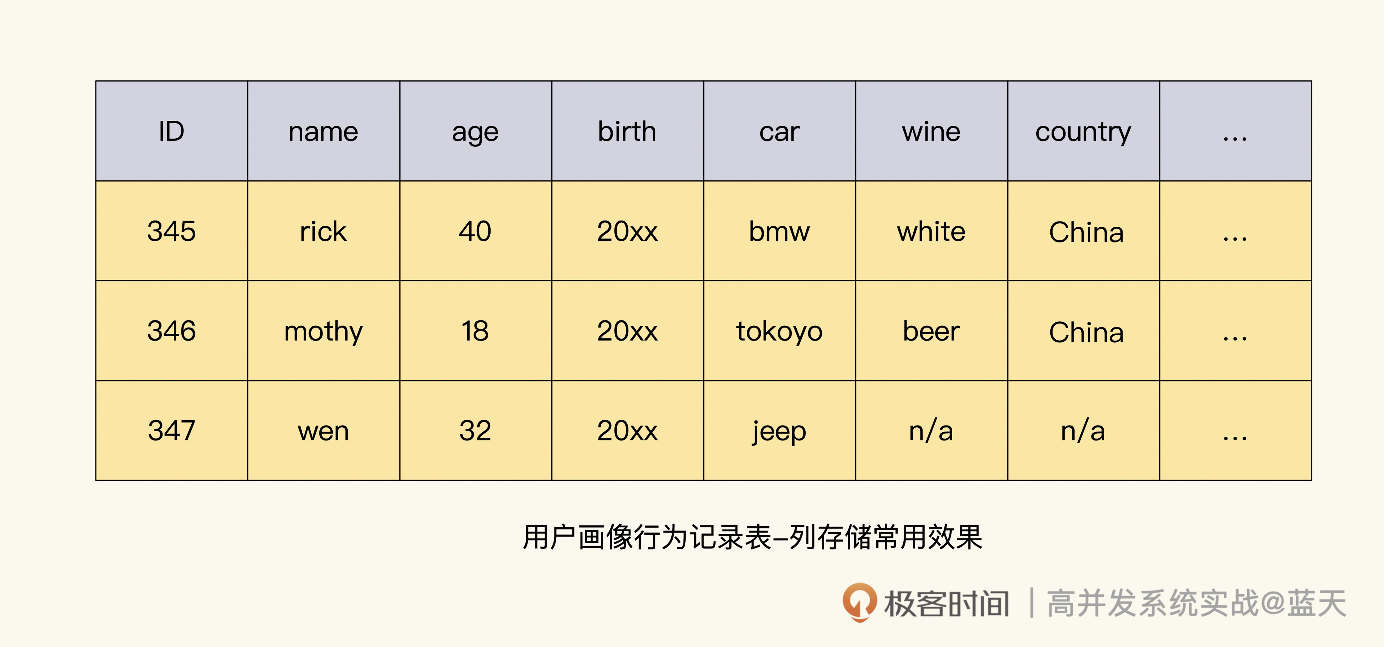 这样组织出来的数据,做数据挖掘、分析对比很方便,不过也会导致一个表有成百上千个字段,如果用行存储的数据引擎,我们对数据的筛选是一行行进行读取的,会浪费大量的IO读取。
