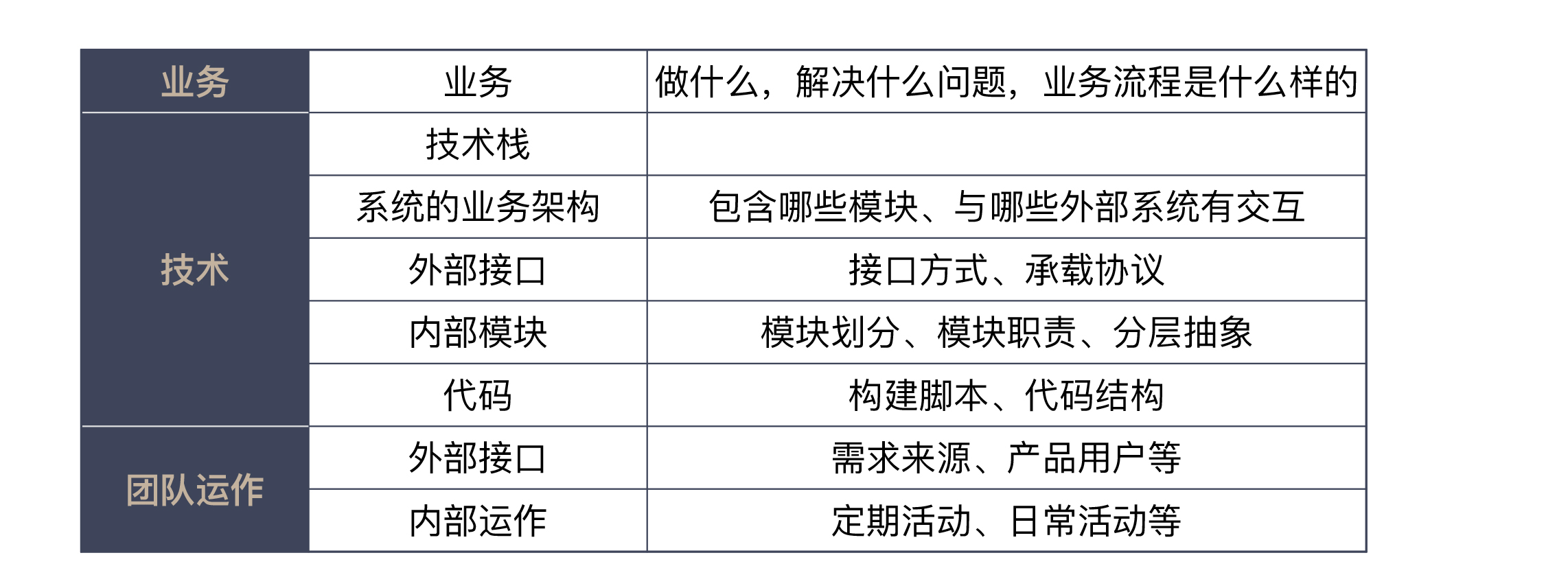 你可以回想一下过往的工作经验,要在一个项目上工作起来,先要了解什么呢?很多人的第一反应是技术,我是程序员嘛,当然就是技术优先了。估计大多数人进到项目里,都是一头奔进代码里,然后,从各种细节研究起来。技术肯定是你要了解的,但它不应该是第一位的。