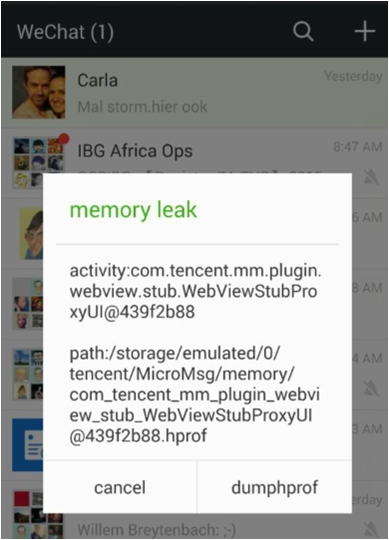 Native内存泄漏监控。上一期我讲到Malloc调试(Malloc Debug)和Malloc钩子(Malloc Hook)似乎还不是那么稳定。在WeMobileDev最近的一篇文章《微信Android终端内存优化实践》中,微信也做了一些其他方案上面的尝试。