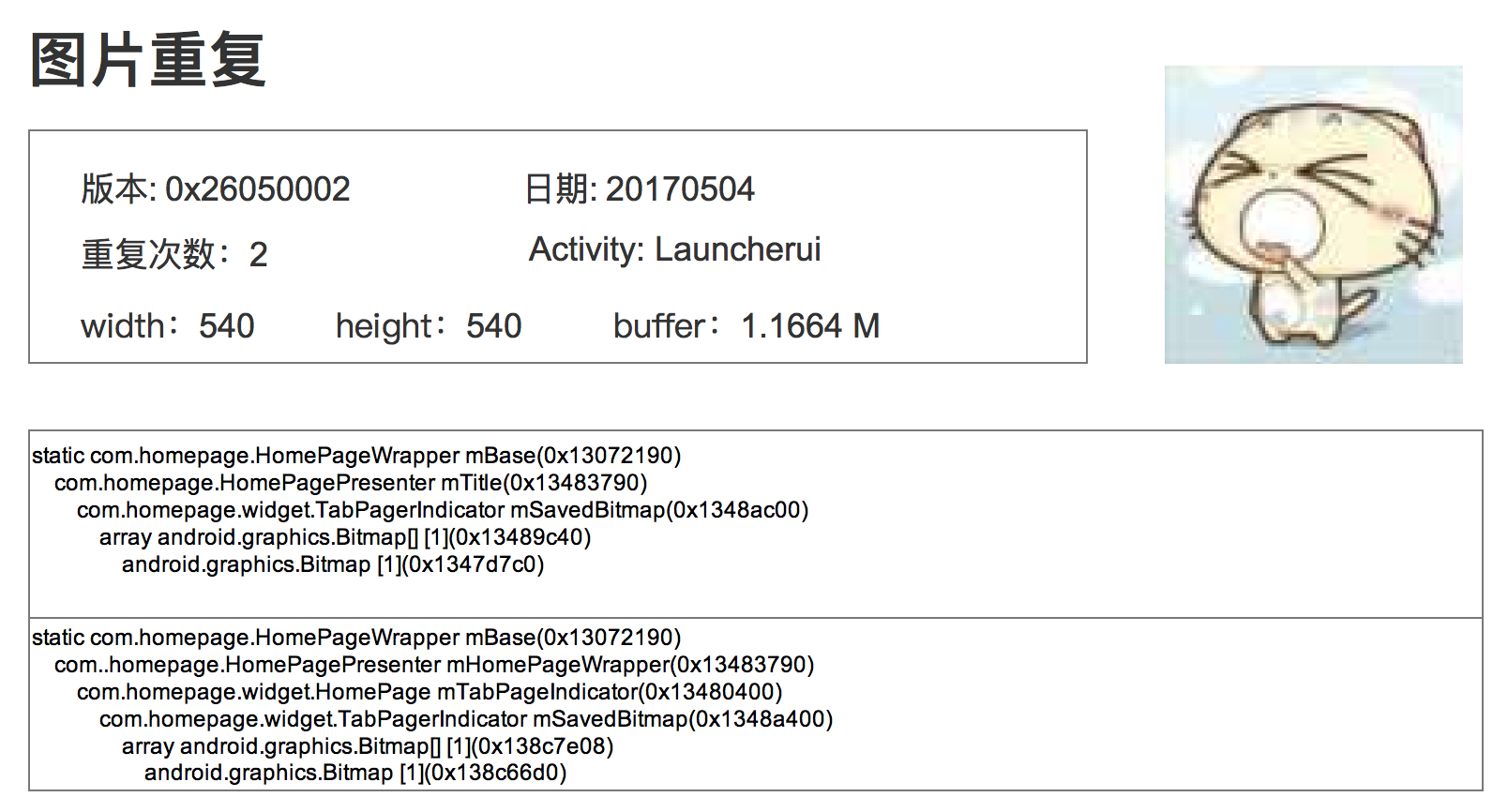 重复图片监控。重复图片指的是Bitmap的像素数据完全一致,但是有多个不同的对象存在。这个监控不需要太多的样本量,一般只在内部使用。之前我实现过一个内存Hprof的分析工具,它可以自动将重复Bitmap的图片和引用链输出。下图是一个简单的例子,你可以看到两张图片的内容完全一样,通过解决这张重复图片可以节省1MB内存。