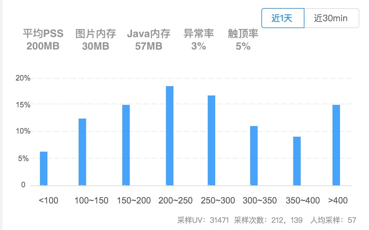 用户在前台的时候,可以每5分钟采集一次PSS、Java堆、图片总内存。我建议通过采样只统计部分用户,需要注意的是要按照用户抽样,而不是按次抽样。简单来说一个用户如果命中采集,那么在一天内都要持续采集数据。