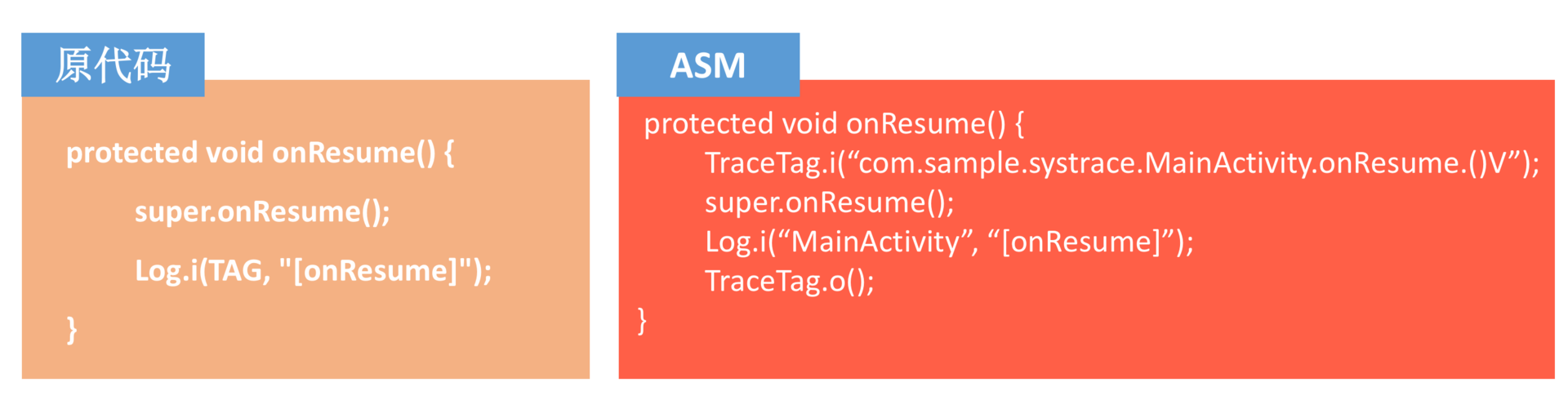 事实上,专栏第7期启动耗时的Sample内部就是使用ASM的Core API,具体你可以参考MethodTracer类的实现。从最终效果上来看,ASM字节码处理后的效果如下。