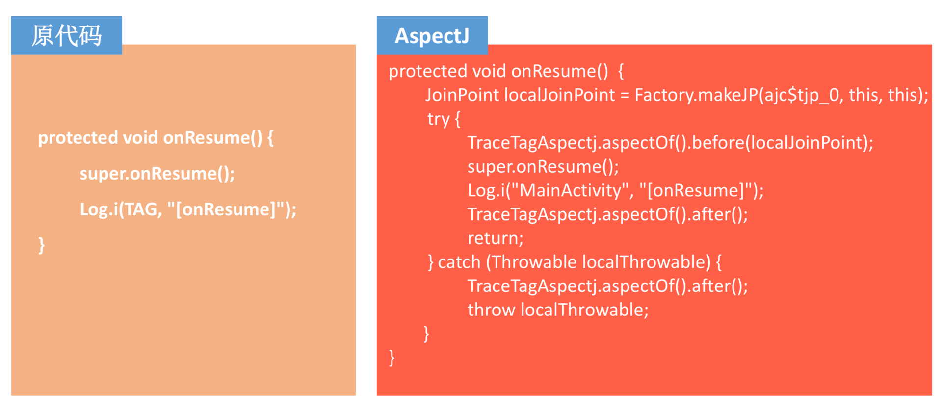 但你可以看到经过AspectJ的字节码处理,它并不会直接把Trace函数直接插入到代码中,而是经过一系列自己的封装。如果想针对所有的函数都做插桩,AspectJ会带来不少的性能影响。