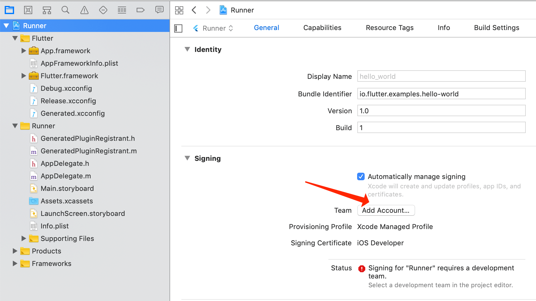 打开hello_world项目中的ios/Runner.xcworkspace,在Xcode中,选择导航面板左侧最上方的Runner项目。