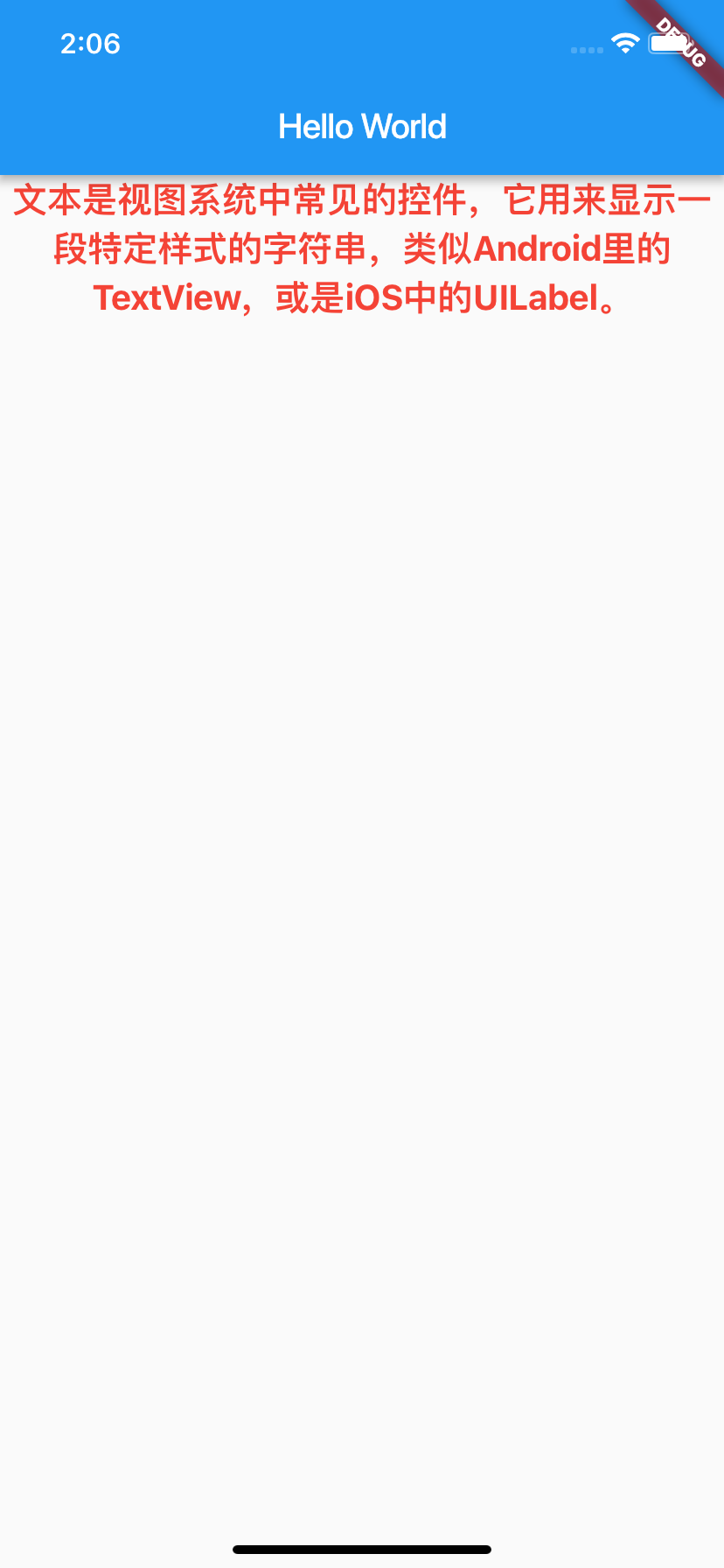 接下来,我们以一个具体的例子来看看Text控件的使用方法。如下所示,我在代码中定义了一段居中布局、20号红色粗体展示样式的字符串: